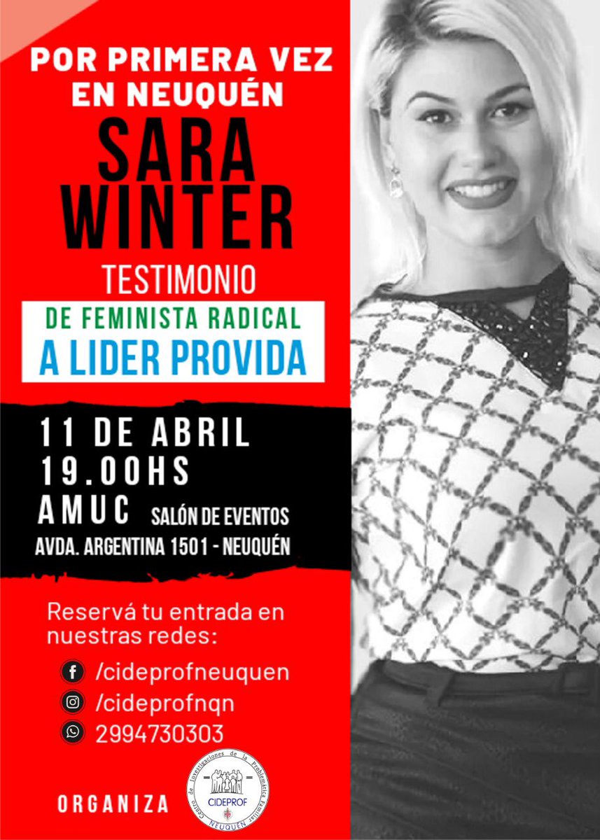 Mi amiga @_SaraWinter estará en Neuquén compartiendo su testimonio: de líder feminista de Femen, a militante ProVida anti feminista. No se lo pierdan!